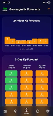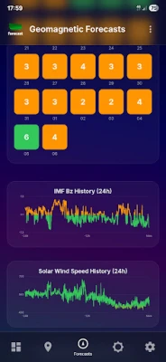 In-Depth Forecasts: For advanced users, dive deep with 24-hour, 3-day, and 27-day Kp forecasts, plus historical graphs for IMF Bz, solar wind speed, and density.