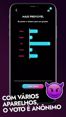 Multiplayer: Divirta-se com um único aparelho ou amplie a diversão usando vários dispositivos (multiplayer online). Vote anonimamente no jogo 'O Mais Provável' ou descubra quem já fez (ou não) algo no 'Eu Nunca'