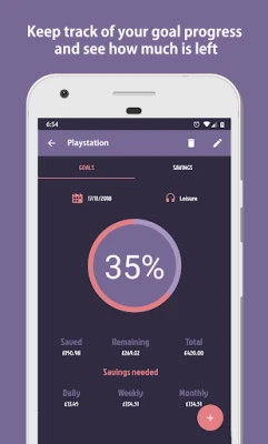โ See the daily/weekly/monthly savings needed to reach your goal โ Track your savings and goal by categories.